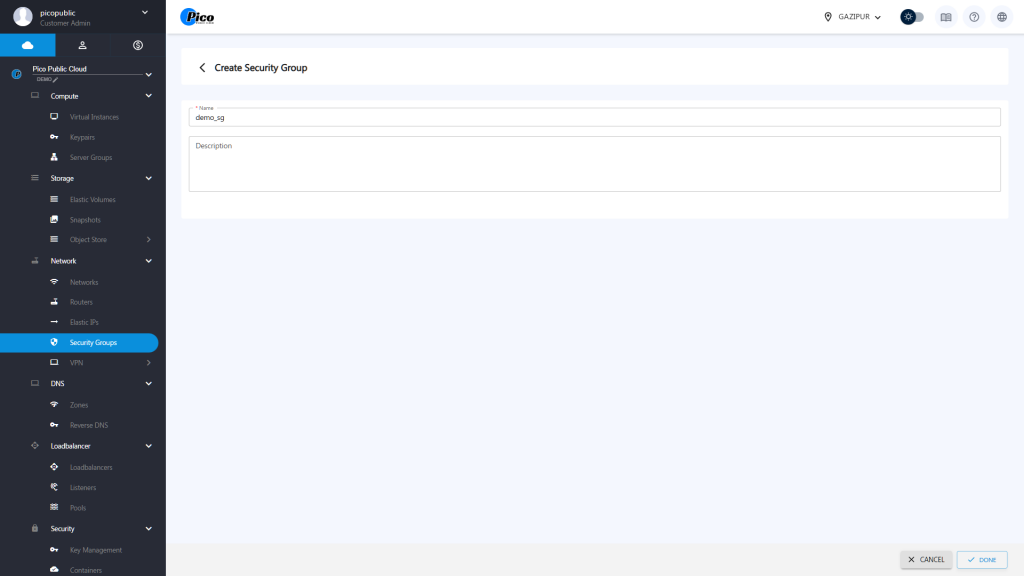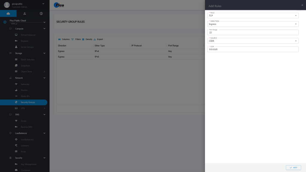 To delete an existing Security Group: Select a Security Group Click on the DELETE button. Press CONFIRM.